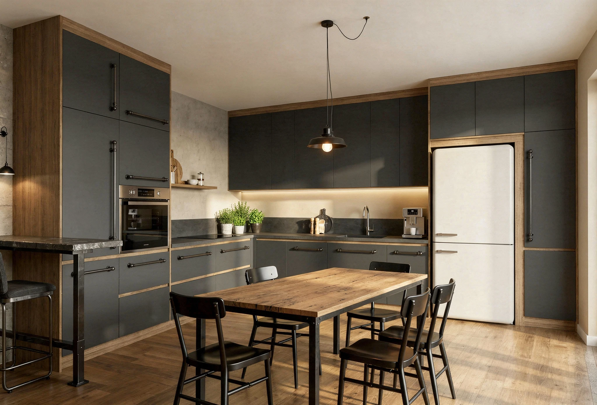 A bold, contemporary étude in texture, pairing deep slate gray with vibrant wood grain for a compact kitchen full of character.