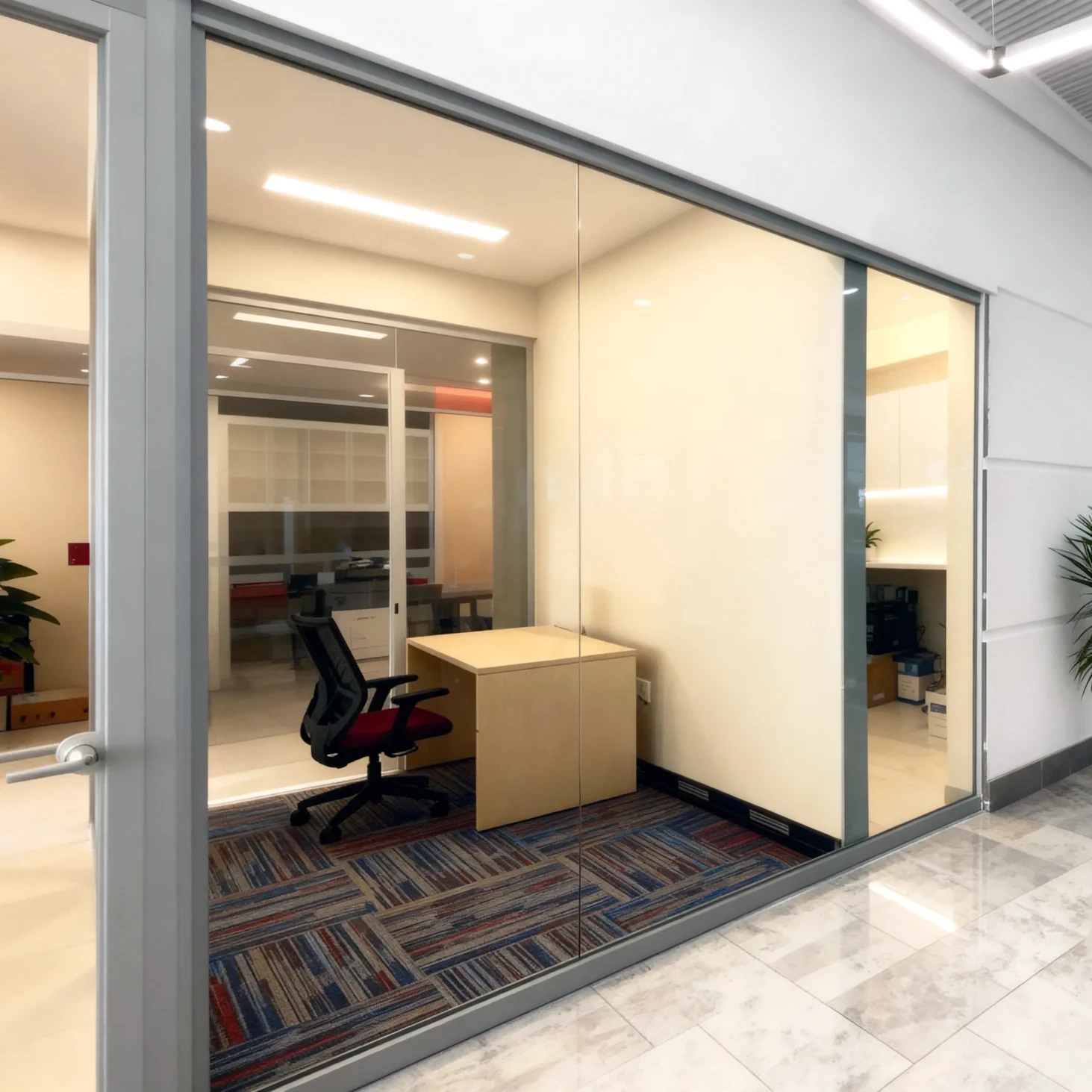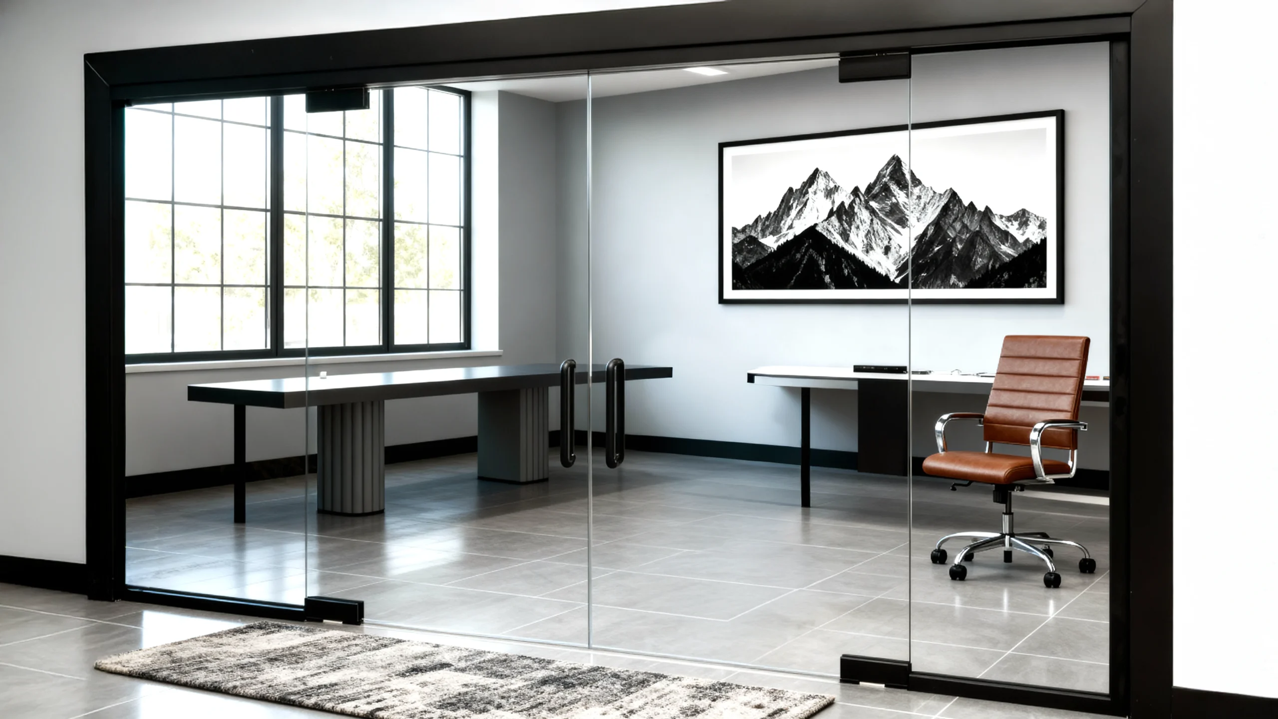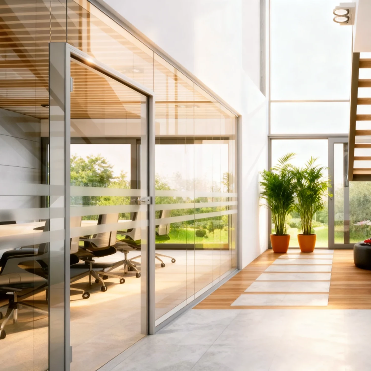 The seamless glass and minimal framing define individual offices, ensuring acoustic separation while maintaining the aesthetic balance and light flow essential for modern corporate environments.