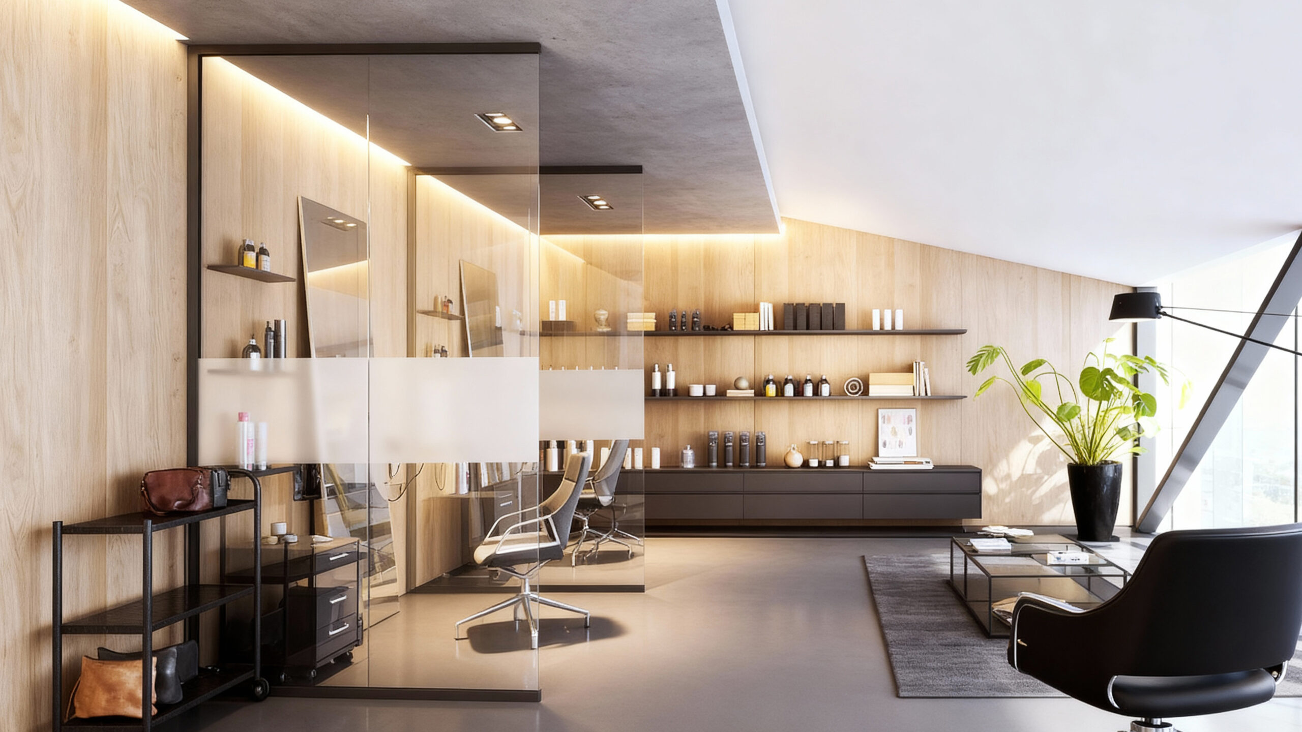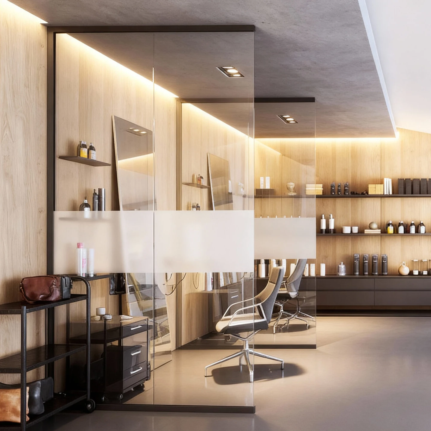 This sophisticated design precisely defines distinct working zones within a larger space. Utilizing minimal framing and a strategic mid-level privacy band, the glass partition achieves clear separation, creating private consultation or service areas while allowing light to flow continuously.