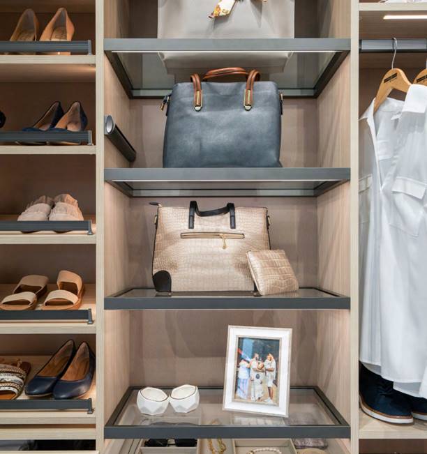 Custom closet organizers combine glass, aluminum and decorative panel materials