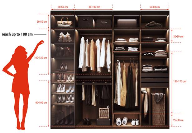 - Hanging Space: Allocate sufficient space for different clothing types. Long-hang sections (for dresses and coats) should be at least 60 inches high, while short-hang sections (for blouses, skirts, and pants) can be around 36-42 inches.