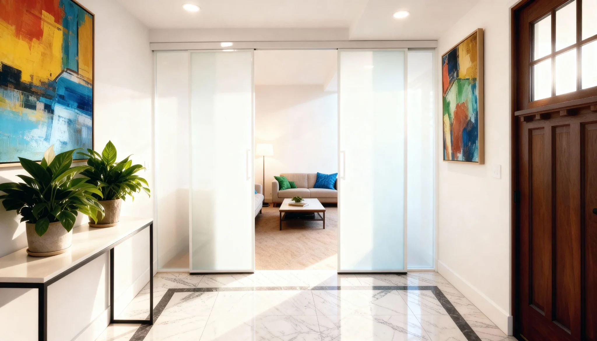 Slim frosted sliding panels close the entryway, shielding the interior from drafts and noise while admitting soft daylight. Narrow aluminum frames free up circulation and floor area, letting the threshold shift instantly between open flow and calm privacy.