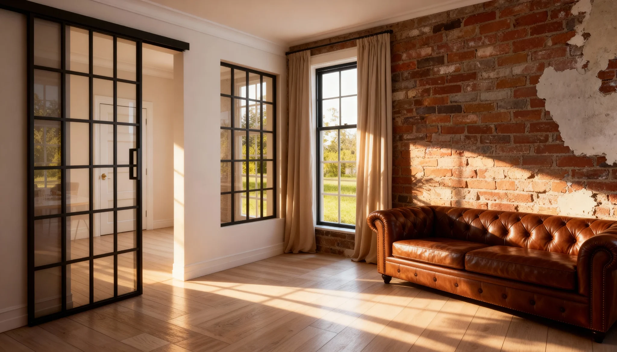 The slim black aluminum-and-glass partitions form a refined, transparent corner boundary that preserves daylight. Narrow profiles eliminate swing clearance to save floor space and enable flexible zoning—letting the room shift effortlessly between open plan and intimate, well-lit areas.