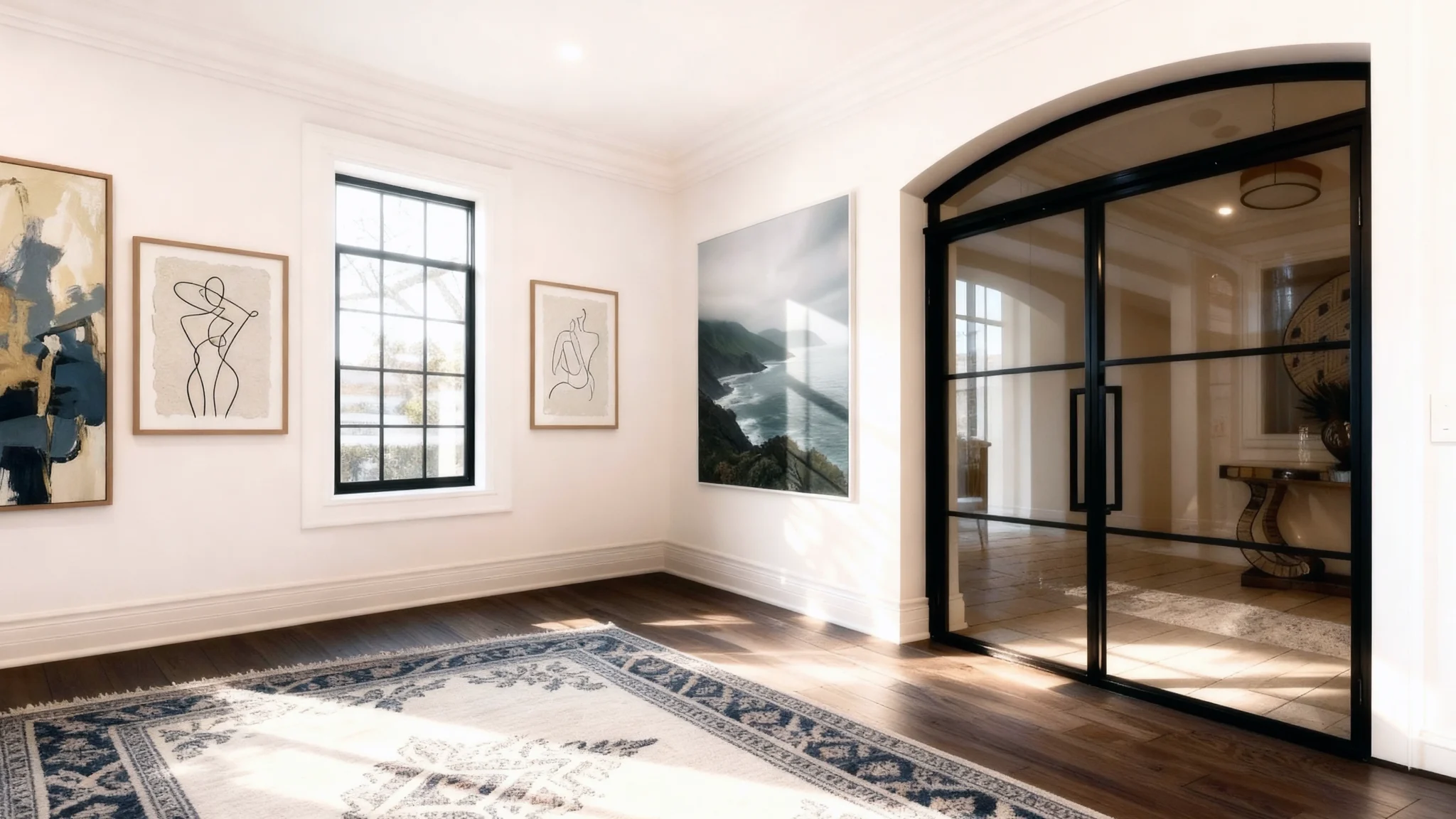 The arched partition divides the room while preserving openness and daylight. Its gentle curve defines a distinct threshold without closing off sightlines, letting light flow across spaces and maintaining visual connection. The result is a defined, airy division that feels purposeful yet permeable—bright, spacious, and quietly separated.