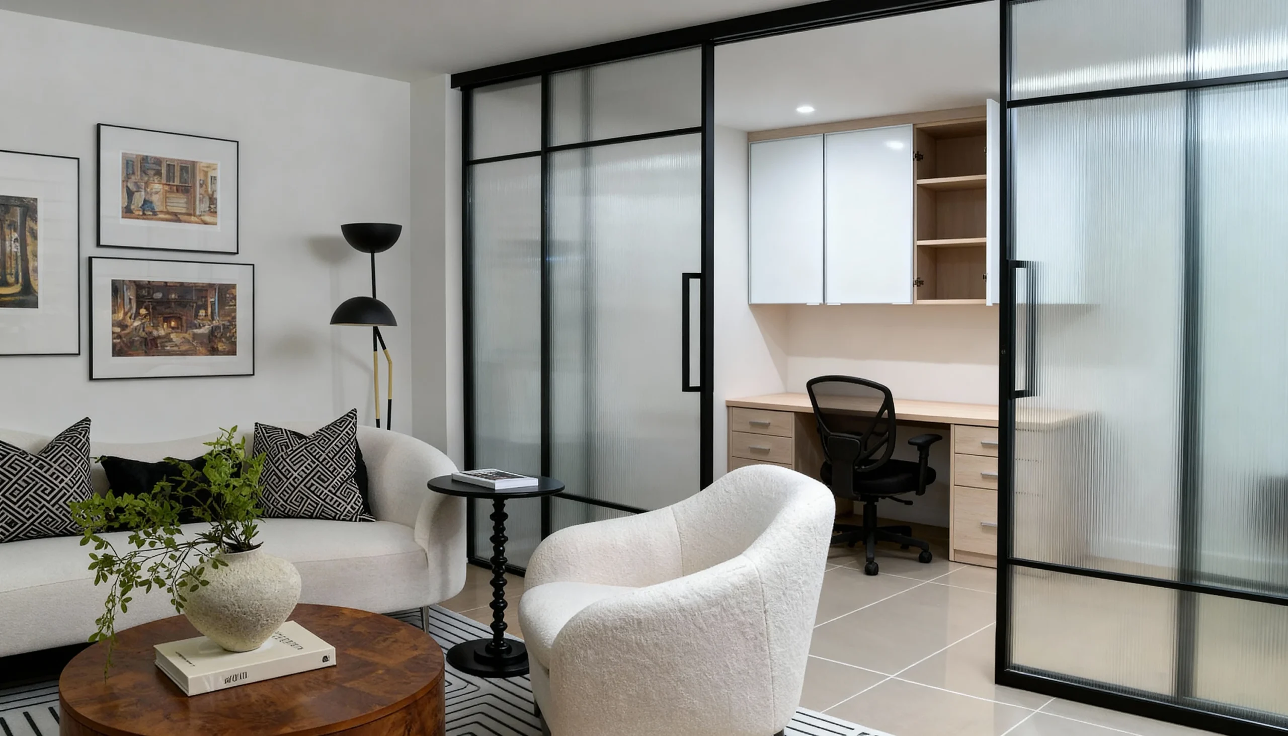 This architectural system creates a sophisticated and functional boundary within the home. The fluted glass panels, set in sleek black frames, provide visual privacy for concentrated work, while maximizing light flow from the adjacent living areas.