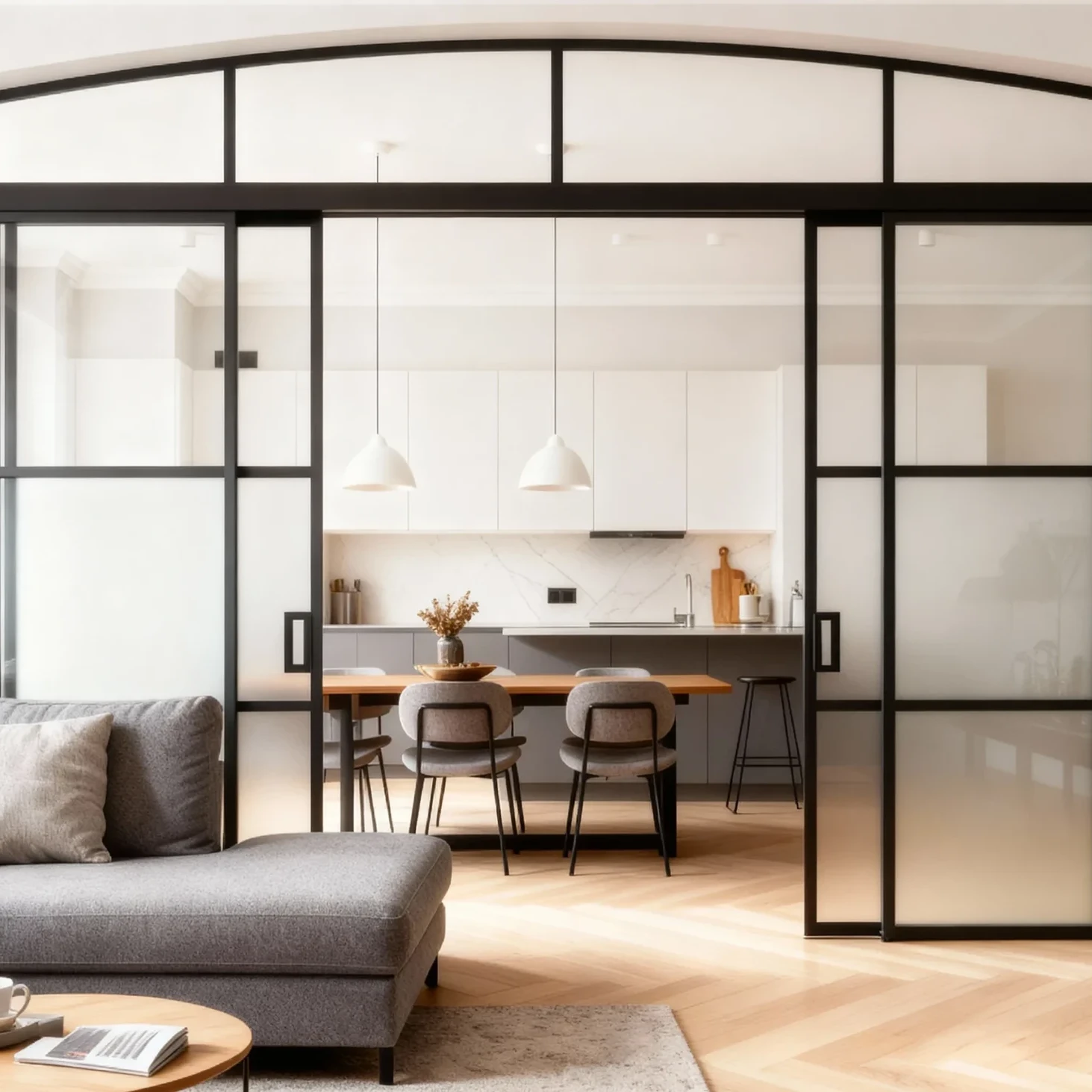 This grand-scale partition features a sweeping, architecturally curved top that brings classical grandeur to modern living spaces. The sliding panels, framed in sleek black metal and blending clear and frosted glass, allow for flexible separation while bathing both the living and adjacent rooms in light.