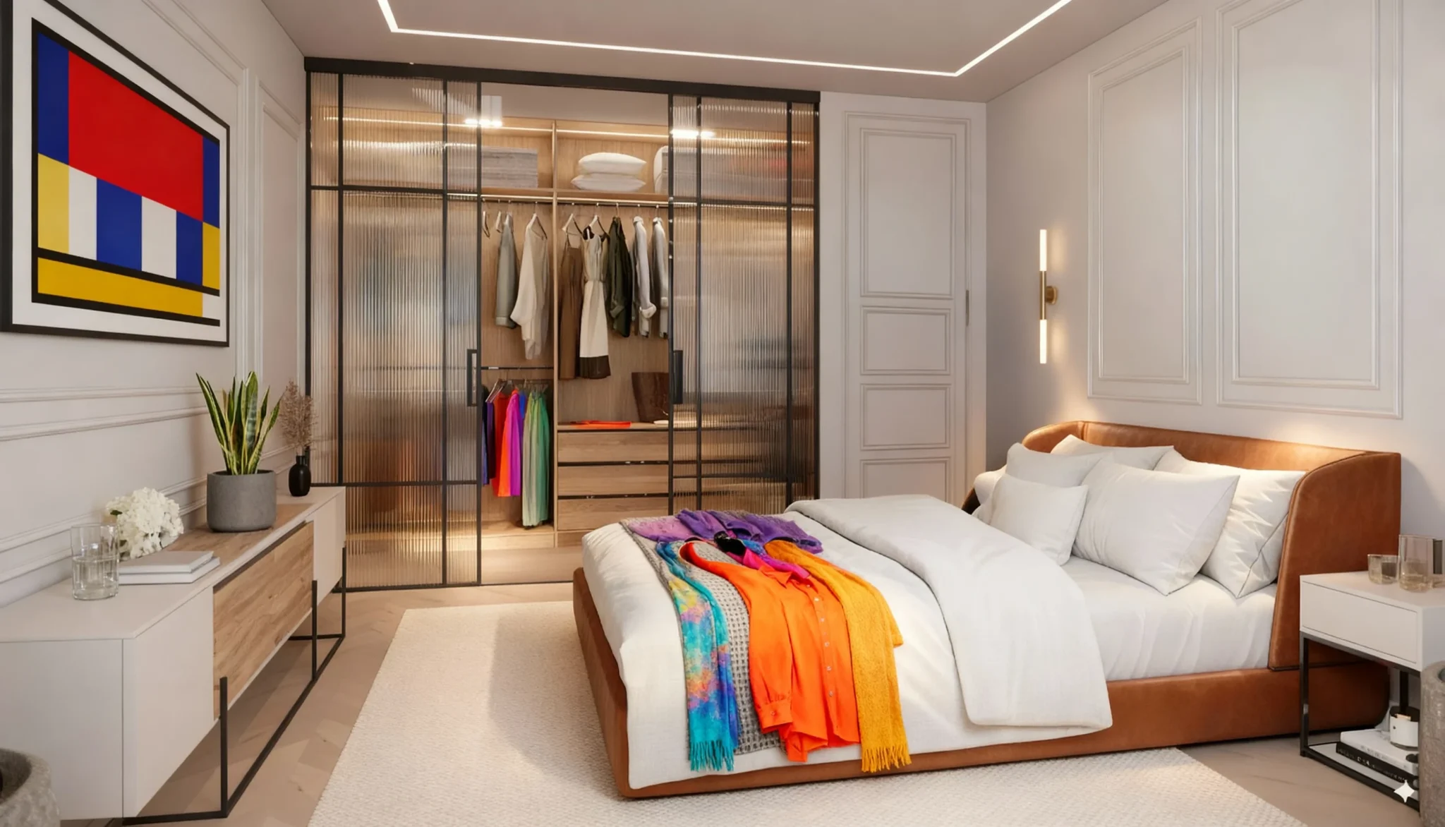 This design is a modern APERTURE into tailored organization. Its sleek black framing and textured glass doors create a refined opening that softly filters the view, revealing a perfectly arranged interior without cluttering the bedroom aesthetic. It is a seamless fusion of closet functionality and integrated furniture design.