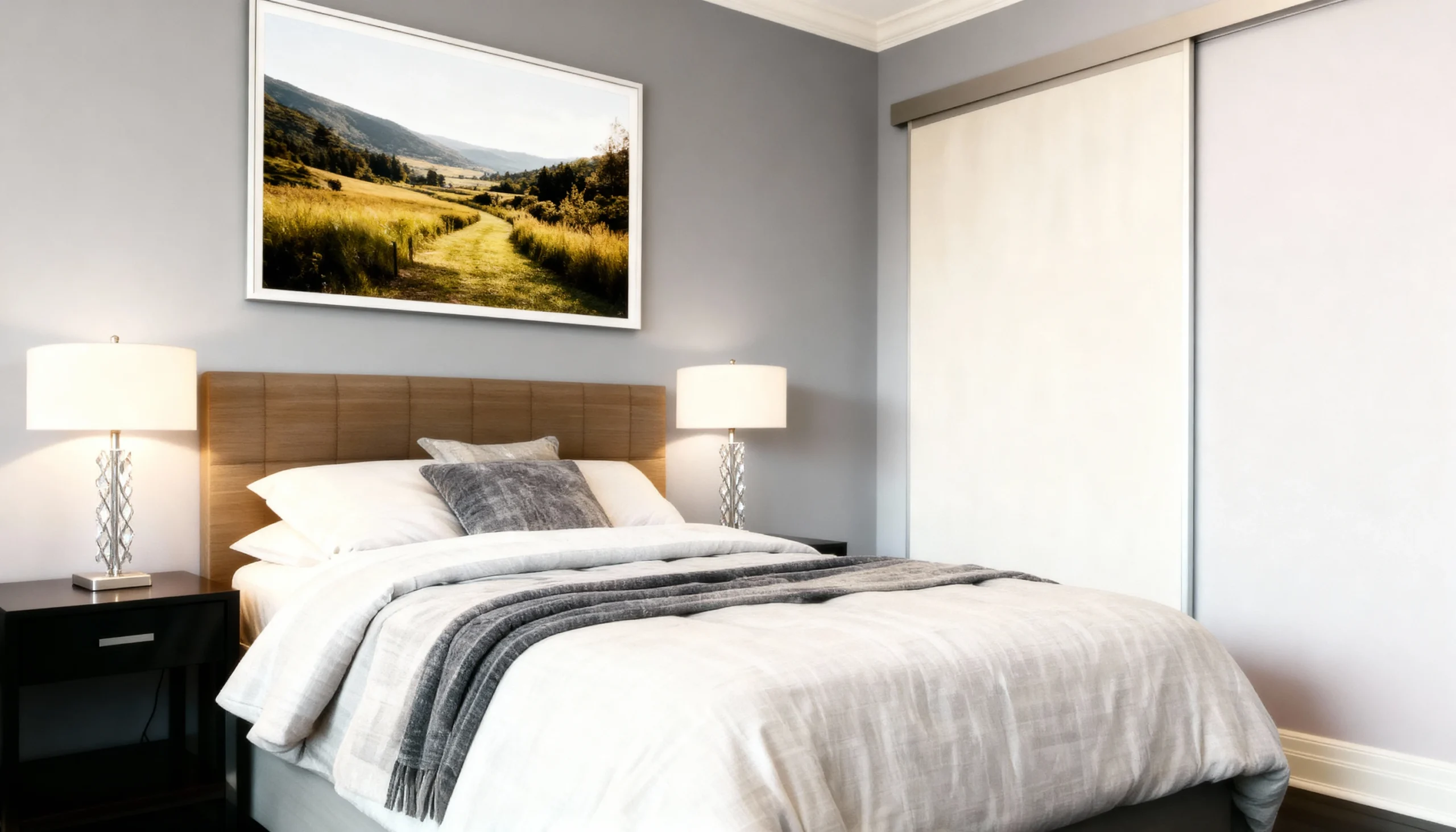 This minimalist system features a wide, uninterrupted plane of closed panels. The sleek, monochromatic doors slide effortlessly, concealing the entire organization system to maintain the ultimate seamless, integrated, and tranquil aesthetic in your bedroom environment.