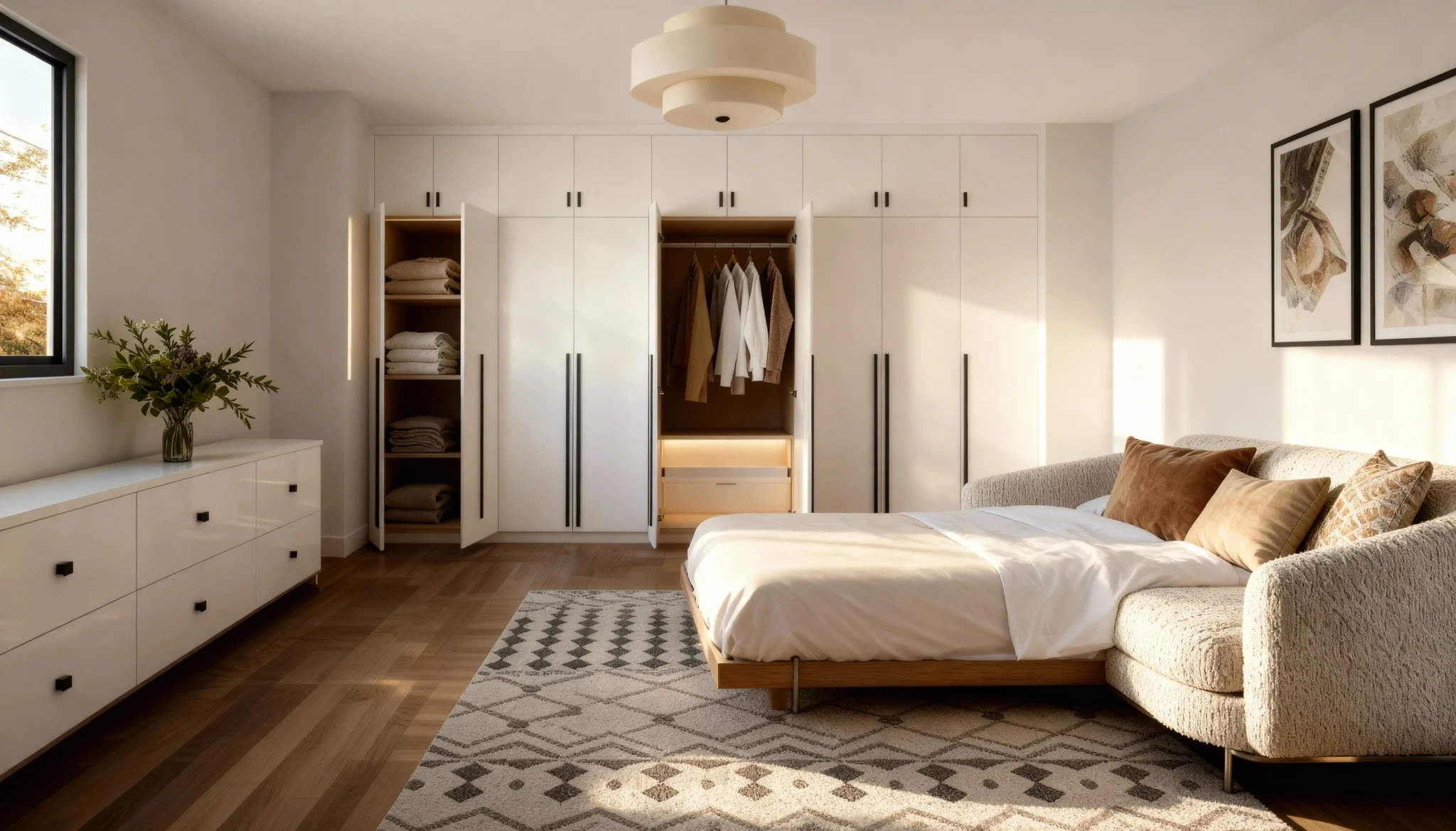 This floor-to-ceiling hinged system is designed for maximum visual cohesion. The continuous light-toned doors, accented by strong black handles, create a single, architectural facade across the entire wall, maximizing vertical storage capacity while integrating seamlessly into the room’s design.
